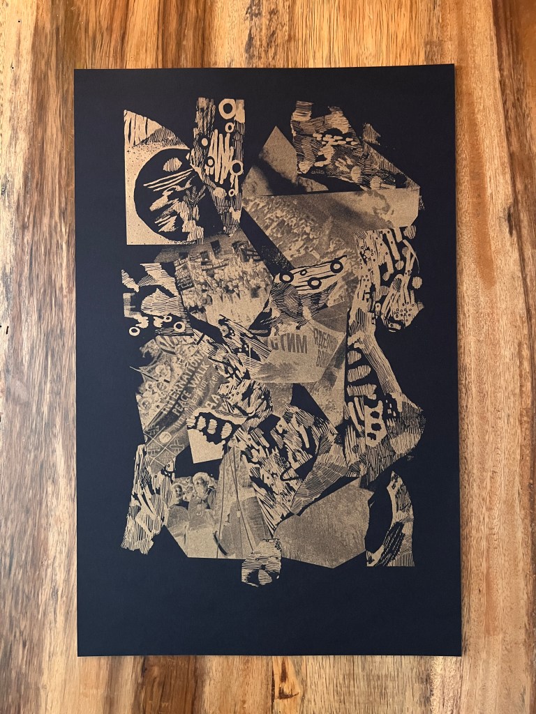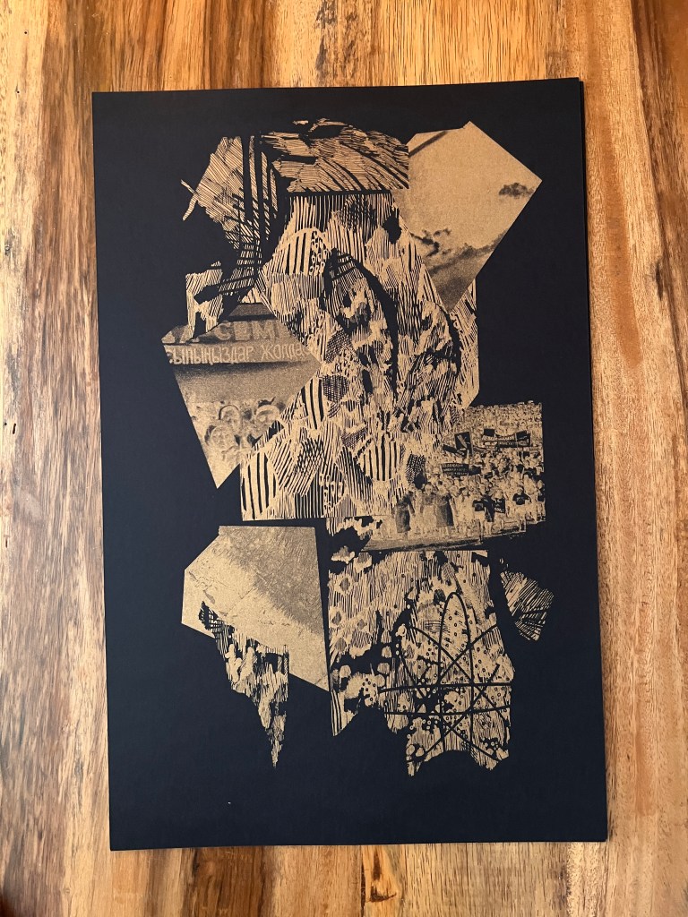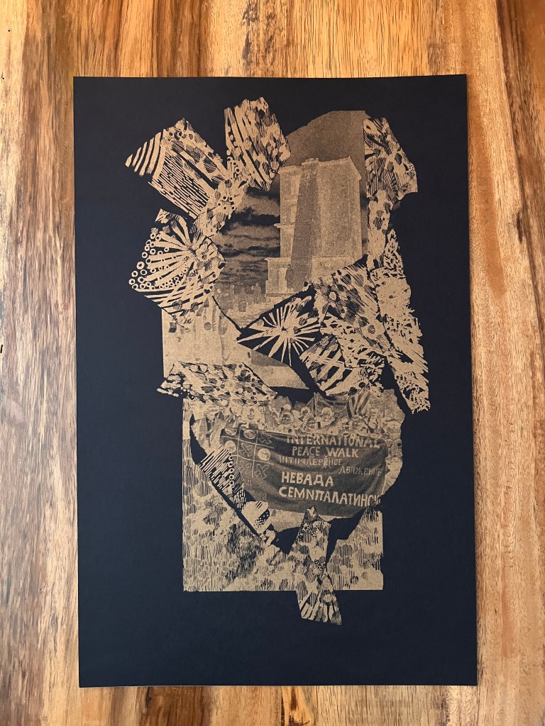 The Risograph prints incorporate my drawing and fragments of images of the struggle to close the Soviet Semipalatinsk testing site in Kazakhstan.