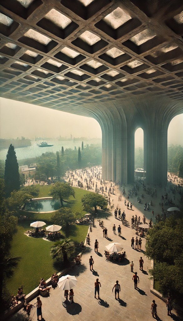 The early afternoon sun cast a golden glow over Venice, its light fractured by the rippling waters of the canals. But the seas were higher than ever, lapping at the edges of ancient stone buildings and newly constructed platforms. The hum of sump pumps echoed through the streets, an unspoken acknowledgment of the city’s precarious future. Yet, amidst this, the Biennale stood as a beacon of inspiration, exemplifying human creativity and resilience.