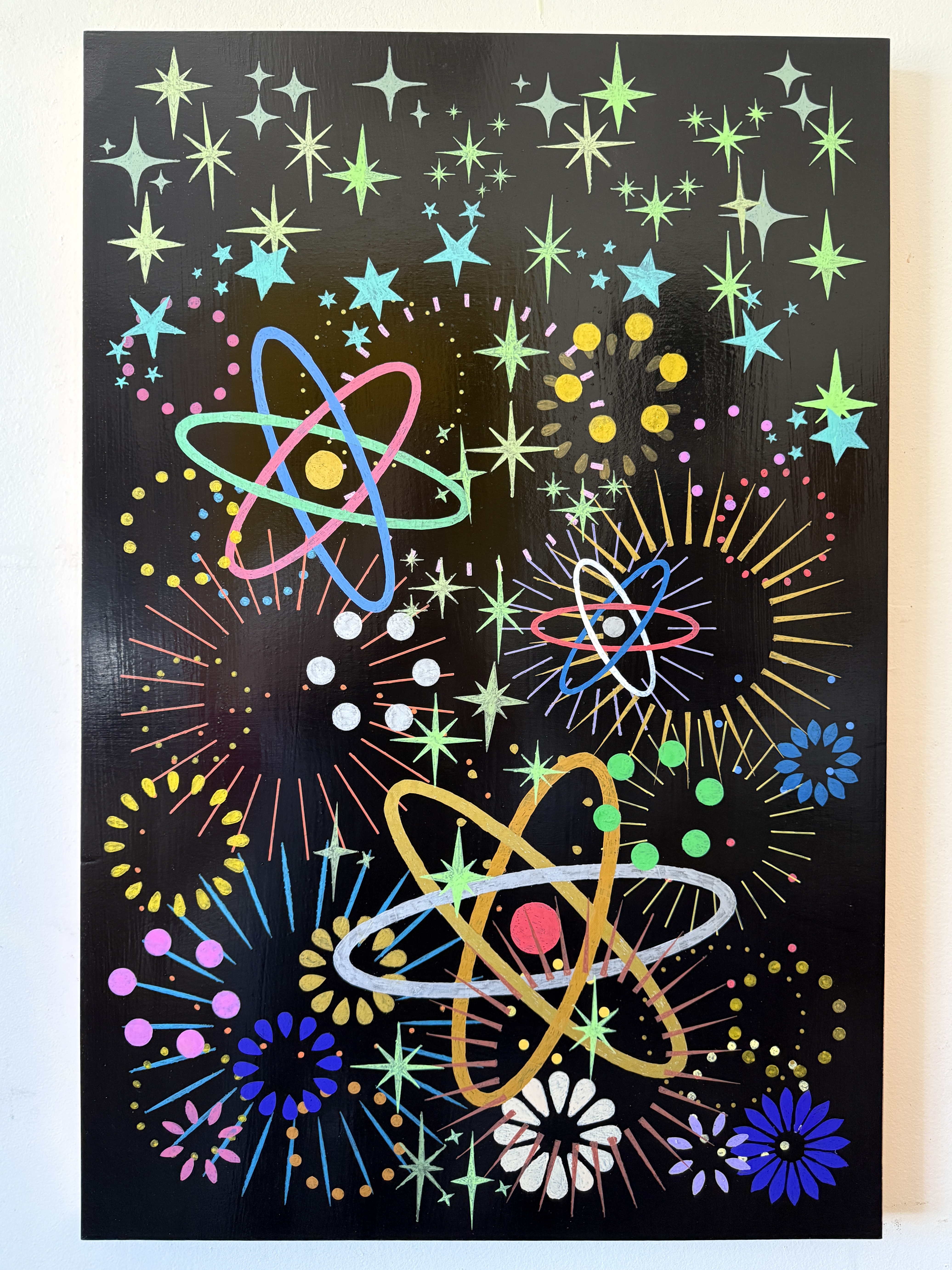“International Atomic Coloring Contest” is a vibrant homage to the exuberance and innovation of mid-20th-century design, reimagined through a contemporary lens. Set against a deep black background, the composition features luminous starbursts and dynamic geometric forms that capture the essence of the Atomic Age’s fascination with space exploration and technological progress. These elements are rendered with crisp lines and bold colors, reflecting the era’s distinctive aesthetic characterized by optimism and forward-thinking.