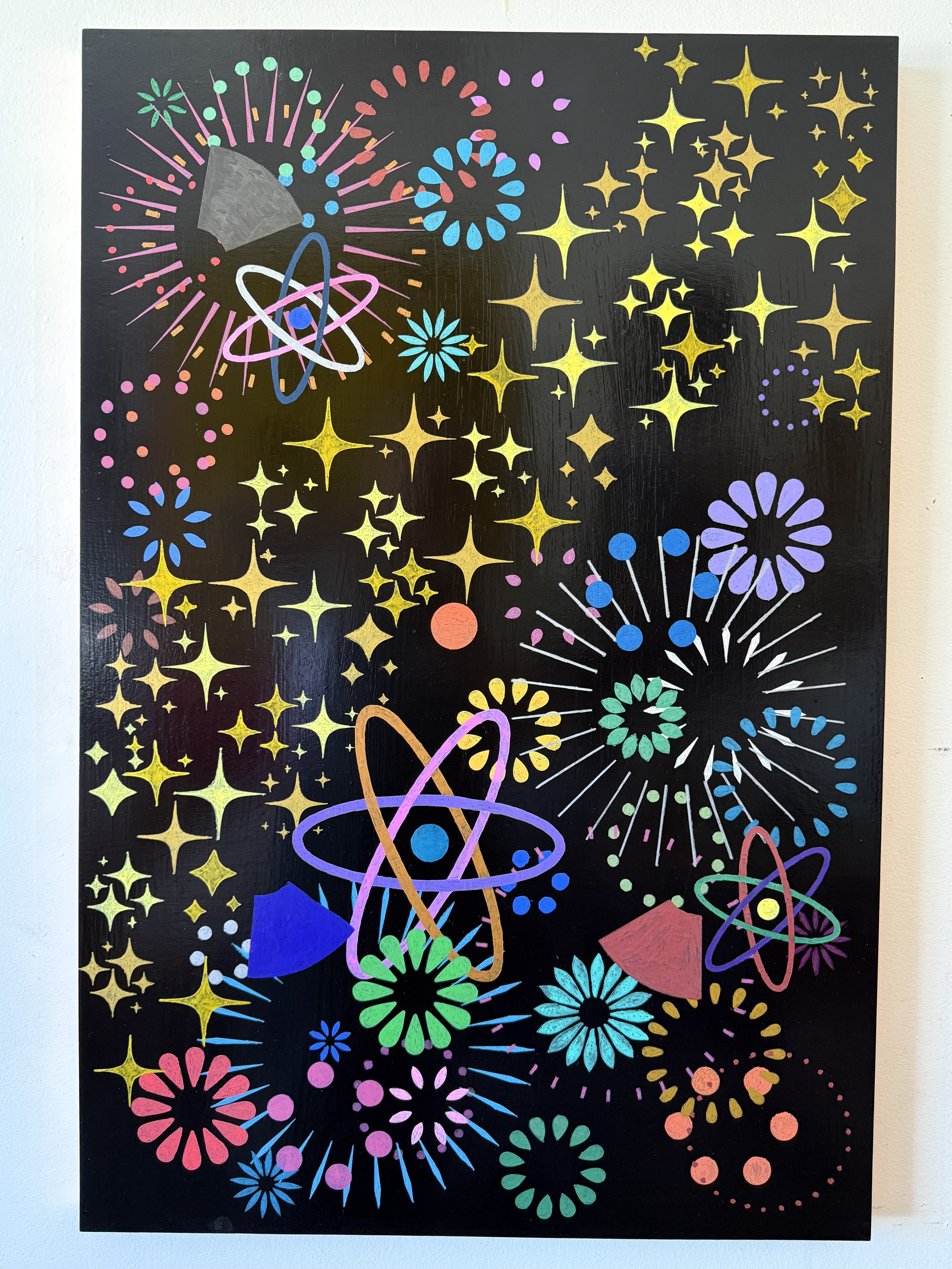 “Toward a Bright XXIst MidCentury” embodies the essence of retrofuturism by harmoniously blending mid-20th-century design elements with a visionary outlook toward our collective future. Set against a deep black background, the composition features luminous stars and iconic mid-century motifs, such as starbursts and geometric forms, that exemplify the era’s clean lines and organic shapes. These elements converge to celebrate the simplicity and functionality that defined mid-century aesthetics, emphasizing form and function in harmonious balance.