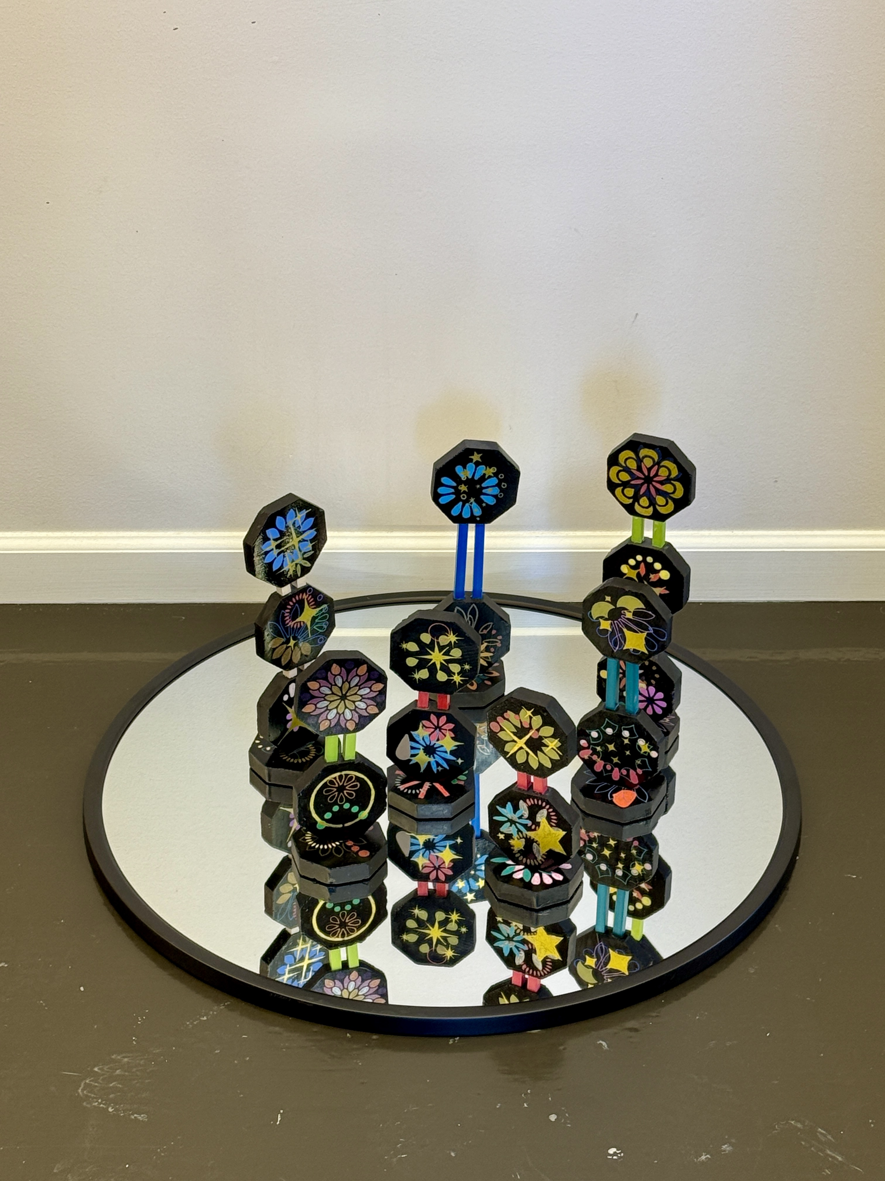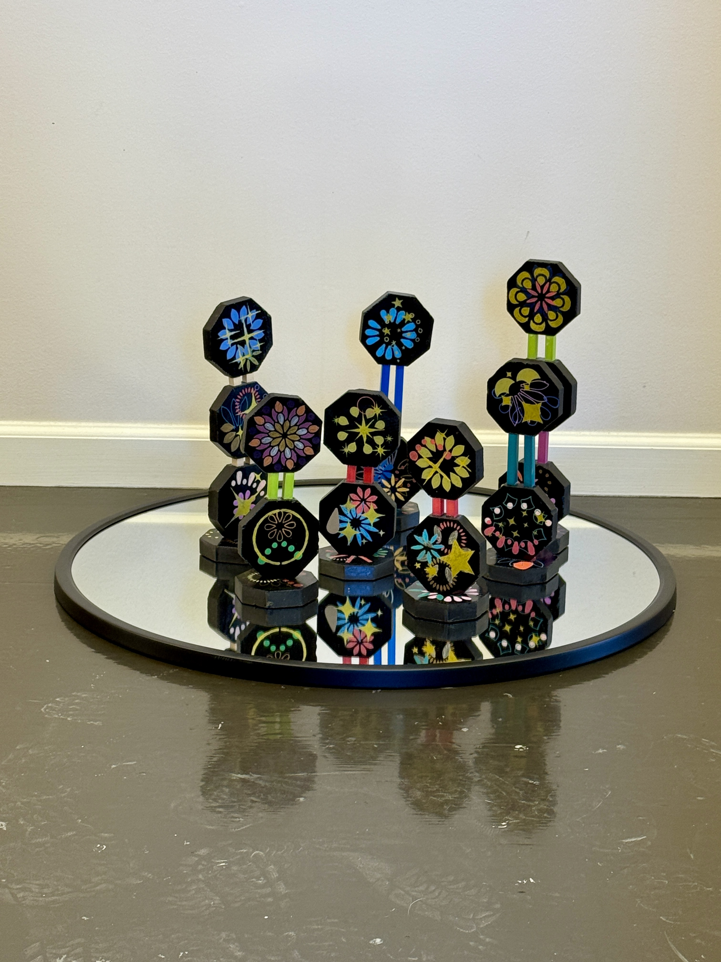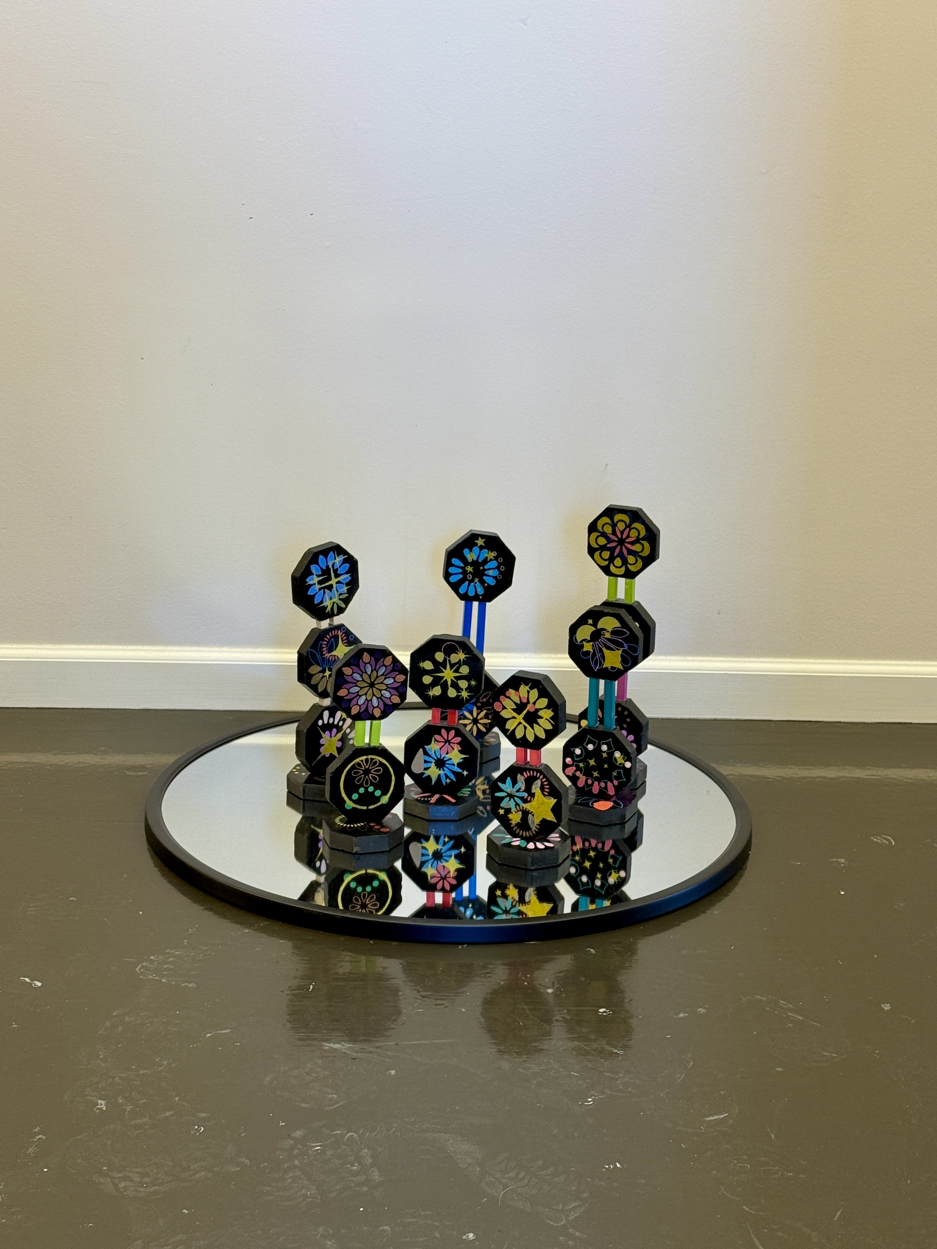 This piece imagines a garden, a devotional structure built not of faith, but of energy, memory, and fluorescence. Hand-painted atomic florals bloom across hexagonal towers, each one rising from a mirrored base that doubles their presence and dissolves their weight. This modular altar honors the unseen architectures that stabilize our world: particles, people, principles. It is both play and prayer, where science becomes symbol, and radiation becomes ritual.
