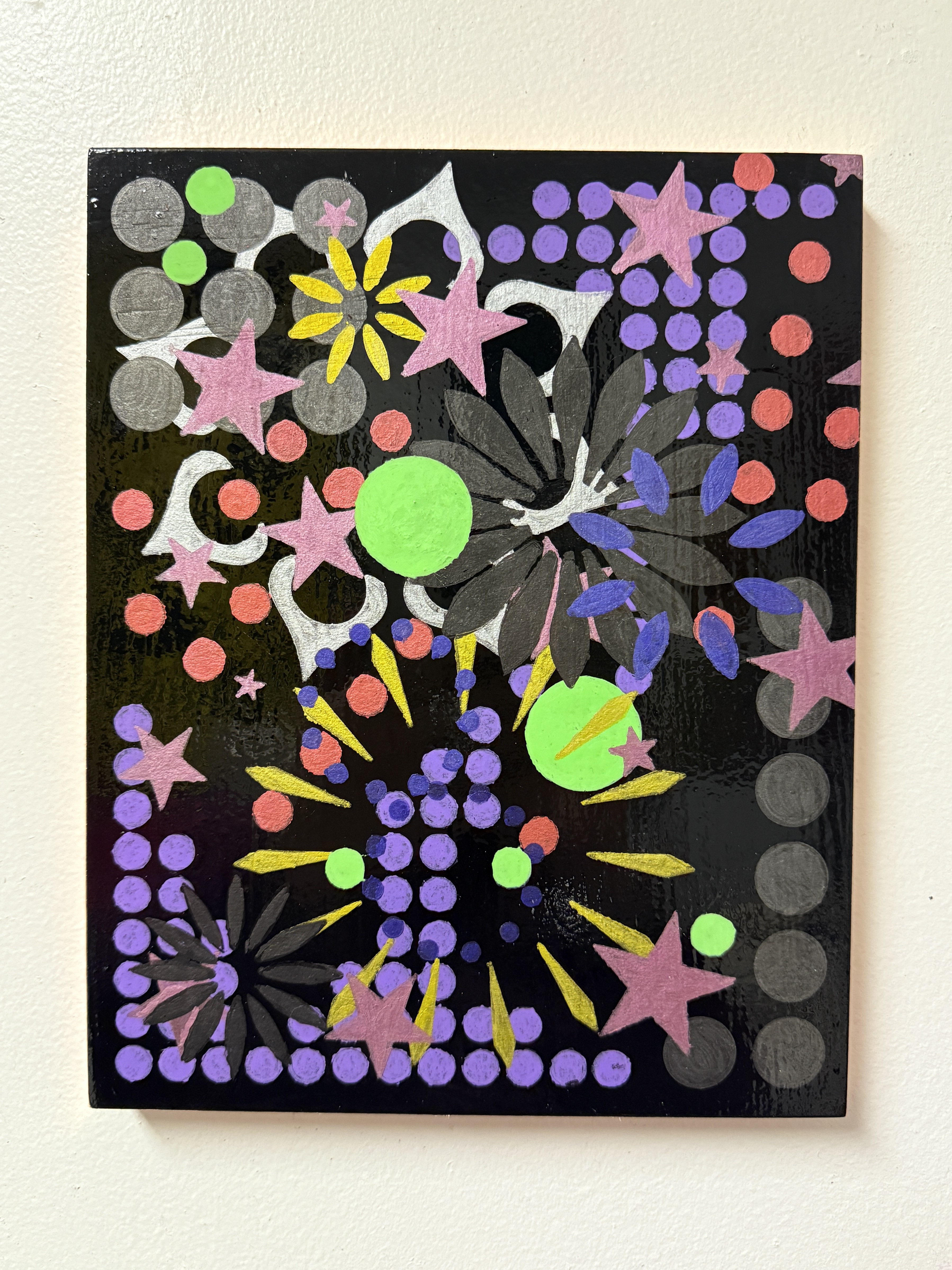 The composition is dense, almost overgrown. There are systems of dots, bursts, and floral forms competing for space, layered like a sonic arrangement where no instrument fully takes the lead. I think of the purple dot grids as a kind of synthetic jungle canopy, under which other forms push through, neon green orbs, black petals, pink stars, all vibrating with their own rhythms.