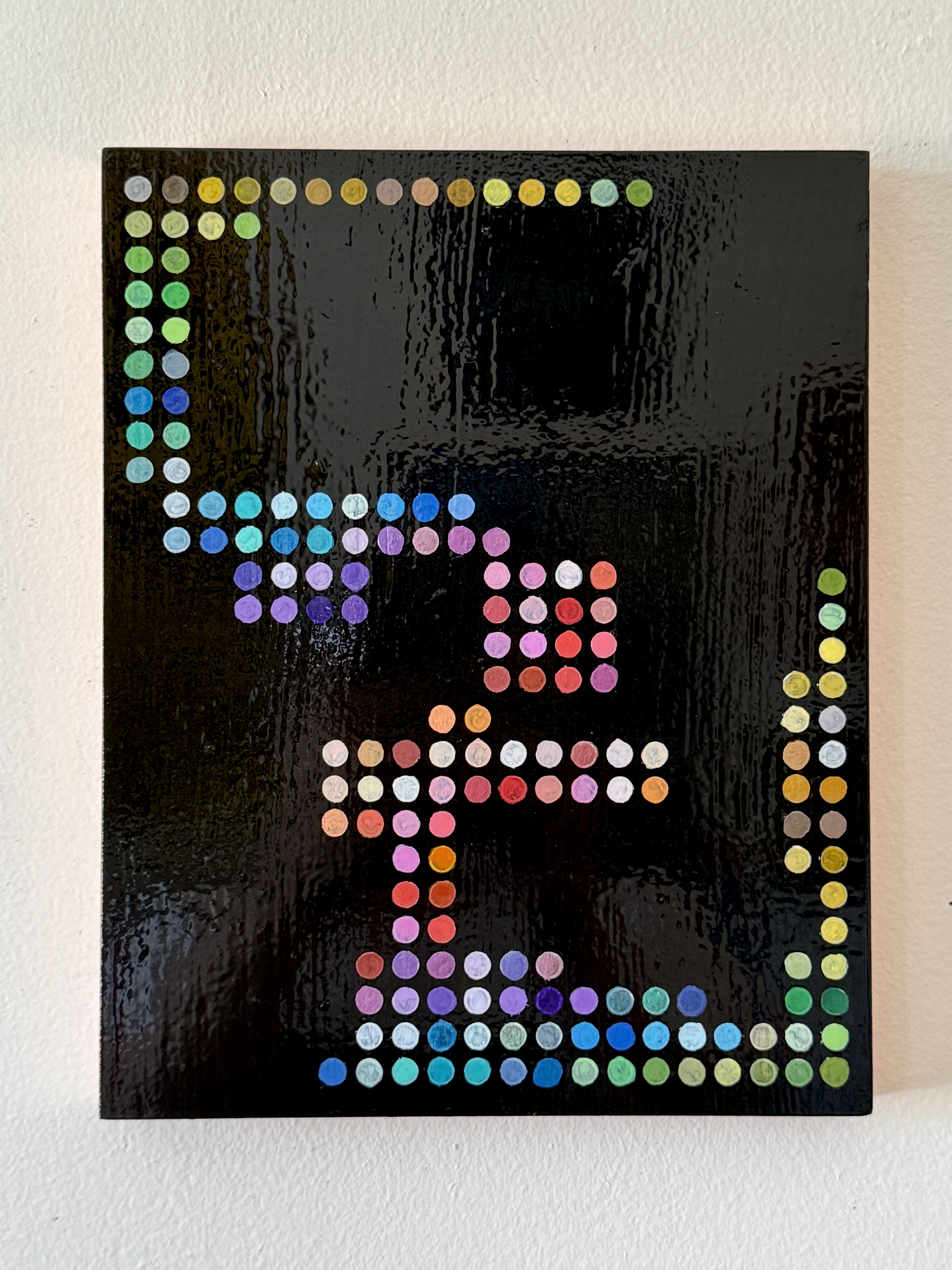 This painting is a visual echo of a rhythm I couldn’t get out of my head, one of Pachyman’s tracks looping in the studio while I worked. His sound blends dub minimalism with digital precision, all anchored in Puerto Rican roots and diasporic memory. I wanted to respond to that musically structured space by building my own: a grid of colorful pulses that move like beats, delays, or echoes in a sound system.