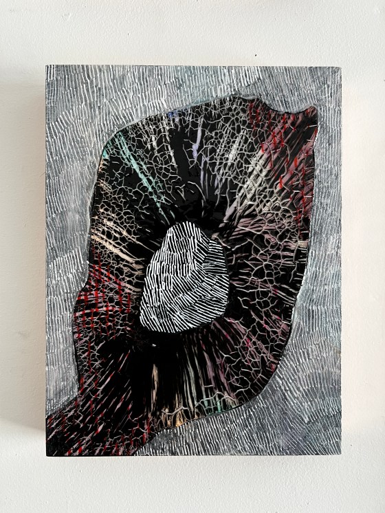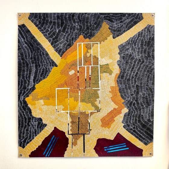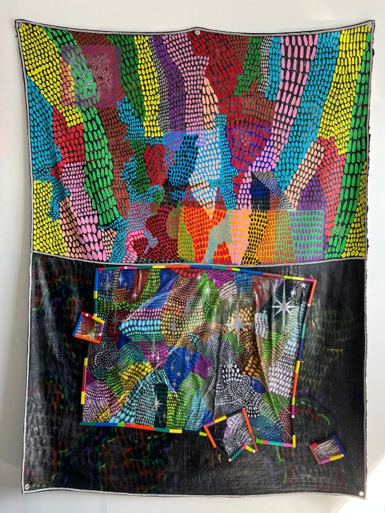 ink, acrylic, vinyl, and steel grommets over Ram Board 38 x 36 inches
