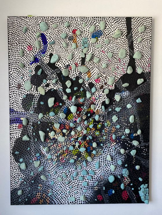 A work inspired by the cosmic origins of uranium. mini level, ink, acrylic, spray paint, and painted rocks over framed … More